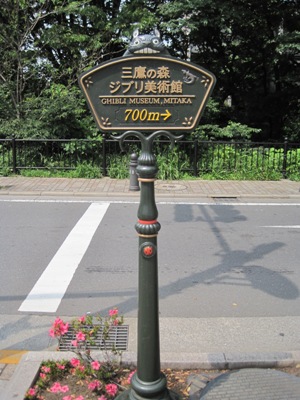 从三鹰车站走下来,那条路虽然就在车站附近,但是却有远离城市喧嚣的感觉。我打工的地方就在三鹰,所以经常在这里出没,但是从来没有发现居然有这么僻静的地方。夏天的这里一定很舒服,因为这里的树荫茂密到太阳几乎照不进来。大概从距离有一千米的地方,沿路就一直有美术馆富有特色的指示牌了,我们也随着指示牌上数字的越来越小开始预热我们探宝的心情~