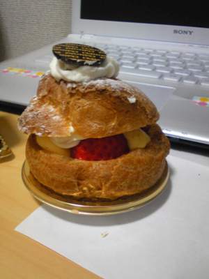 介个是我滴,吼吼~泡芙奶油草莓蛋糕,两种奶油,面包+蛋糕,很好吃!ご馳走さま^ ^