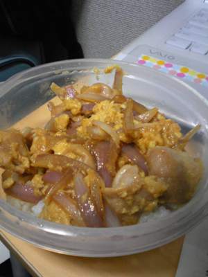 然后最后一张是我今天的午饭。本来是个很完美的親子丼,结果烧好才发现我买鸡肉的时候不小心买成了鸡胗,味道那个微妙啊。。。我还特地用了前两天买的酱。酱很好吃啊!!全坏在鸡胗上了。。。我都不知道烧剩的半盒要怎样= =吃这碗的时候,我就把鸡胗先痛苦地吃掉,然后再享受洋葱和蛋。。。哎~这是命运TAT