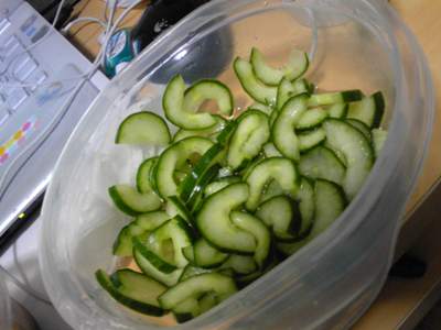 然后今天为了做三明治,买了黄瓜。突然发现上次买了醋,剩下的黄瓜可以糖醋凉拌吃!于是就有了这盆凉拌黄瓜~话说这里的黄瓜灰常滴脆~~