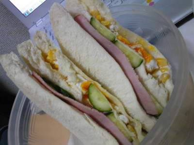 然后就是三明治了~~总感觉光吃切片面包很无聊,而且我还有一大罐色拉酱,于是就想方设法换花样。这次就是三明治了~~其实觉得应该放生菜的,但是今天跑到超市一看,生菜要一大棵一买。。。我又不爱吃煮熟的生菜,所以就换黄瓜了。看上去有点单薄~不过味道应该还可以的!
