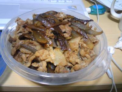首先是牛肉饭。这个在日本是非常多的,吉野家啊松屋之类的都有,便宜又好吃,可以说是最普遍的饭了。里面放的是牛肉和洋葱。当然,猪肉也是可以的~~于是我就自己买了洋葱和牛肉烧了。个人觉得日本的洋葱比中国的好吃。很甜,没有那么大的味道,很适合做料理。做的方法其实也蛮简单的。洋葱切丝先放在油里炒一下,然后放下肉片,这个肉是超市直接买切好片的,这个超市里最多了。然后放点酱油,就大功告成了。味道还不错哟~~