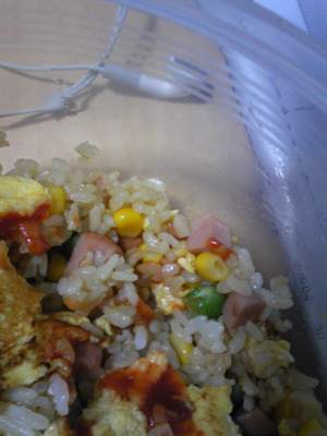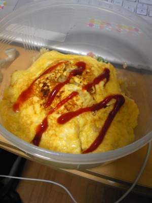最后是今天烧的蛋包饭!日本的蛋包饭还是蛮有名的,昨天电视里正好看到,就想烧了。于是今天就去买材料了。本来想着好像挺麻烦的,又要香?又要青豆的。。。后来发现炒饭的那些材料都可以在罐头区找到,而且还挺便宜的~~然后番茄酱也挺便宜的,一瓶不小的番茄酱比一小盒番茄还便宜呢。于是万事俱备,我就把火腿肠切成小丁,加上玉米和青豆和饭炒,最后把蛋煎成一层,盖上去浇上番茄酱就ok了。虽然蛋煎的时候有点破了,不过整体来看还是不错的,而且味道也蛮好~剩下来的材料还可以炒个一两次,厚厚~蛋包饭我来了!!
